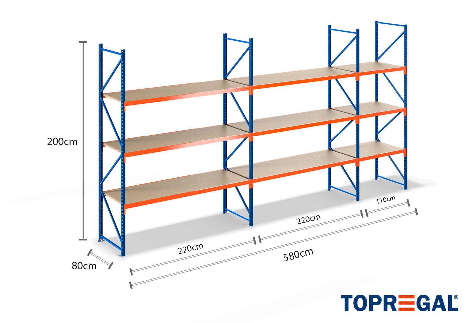 5,8 m storage rack LR2000 / 80 cm deep / 2 m high / 3 levels / rack layer Wood
