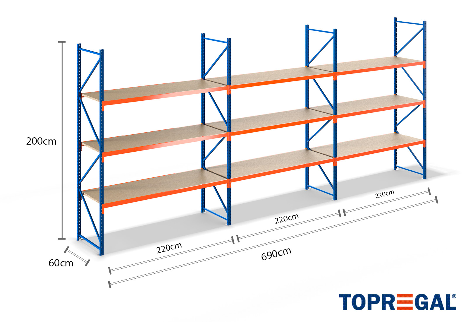 6,9 m storage rack LR2000 / 60 cm deep / 2 m high / 3 levels / rack layer Wood