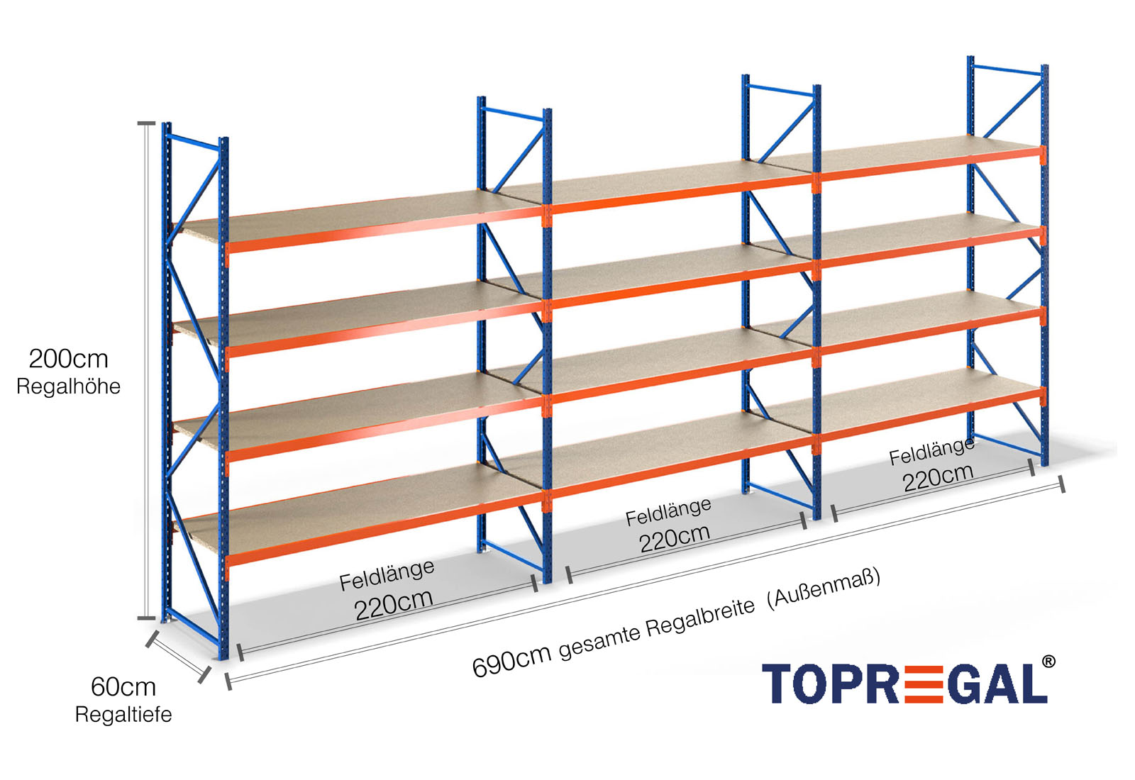 All data refer to evenly distributed loads. When loaded, the shelf load and field load must not be exceeded. In principle, the current guidelines on safety and health at work (german DGUV Rule 208-061) apply during use. TOPREGAL accepts no liability for accidents/damage caused by improper use. Our expert advisory team will be pleased to answer any questions you may have. Dimensions given are approximate and may deviate by a few centimetres. Contact us if you need the exact dimensions for your desired product.