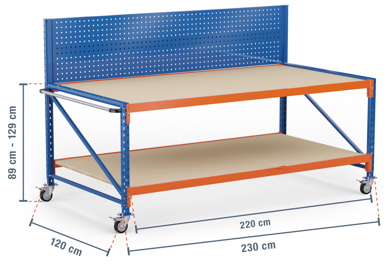 - 2 x storage rack upright / 0,89 m high with 40 cm height-adjustable foot part / 120 cm deep with castors (for perforated rear panel)